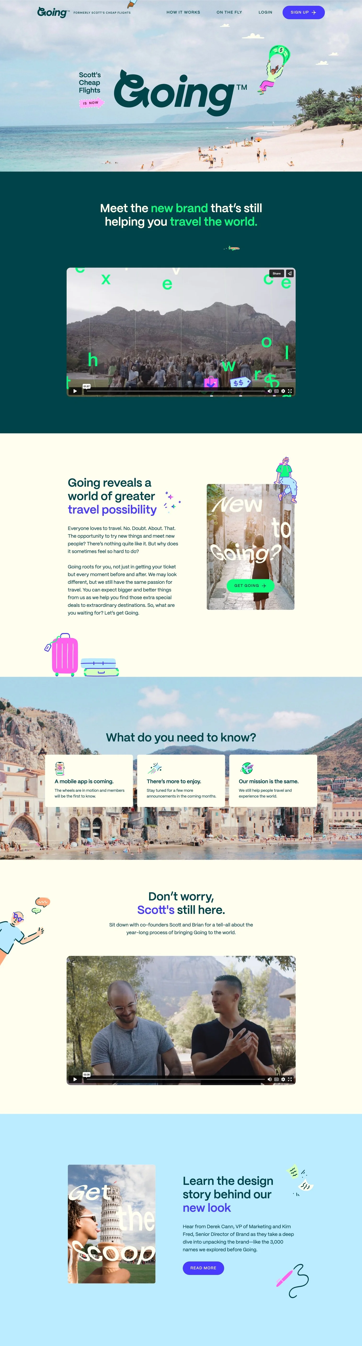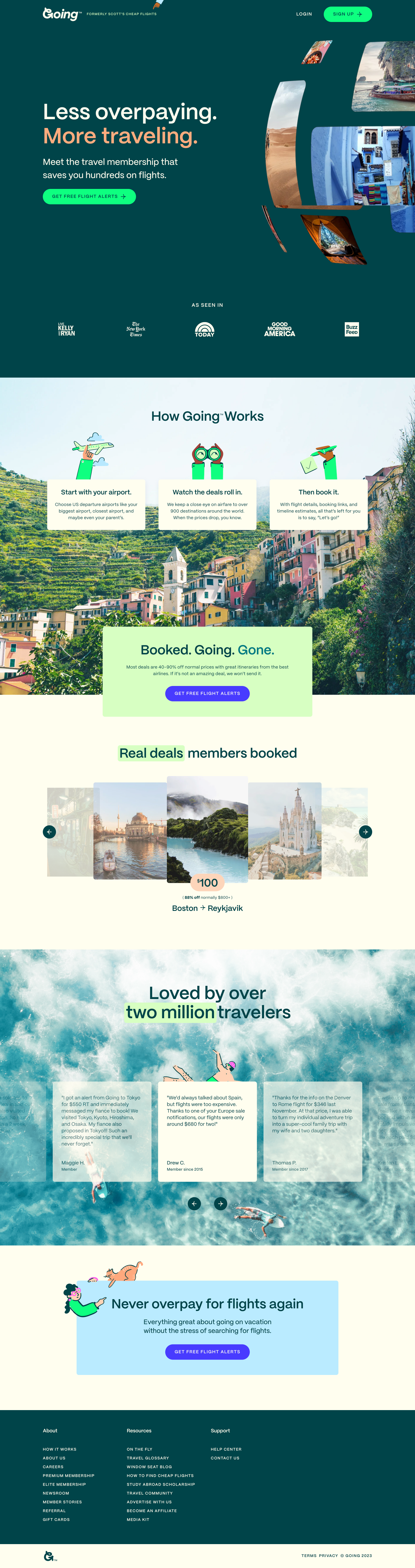 In 2023, Scott’s Cheap Flights relaunched as Going, a travel membership that saves you hundreds on flights. I joined the team to help transform the voice of SCF into something new. Going is conversational, witty, and playful.