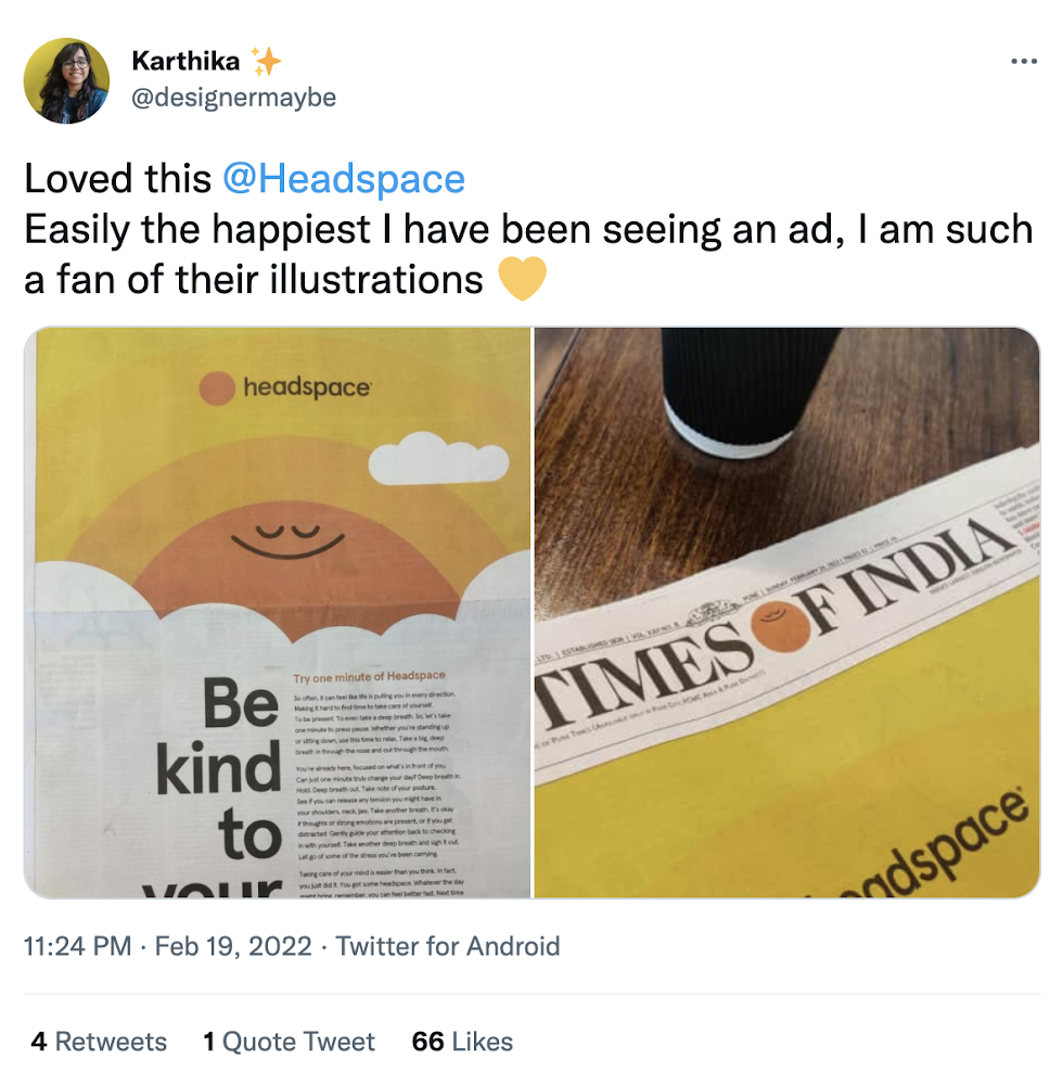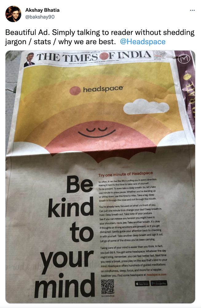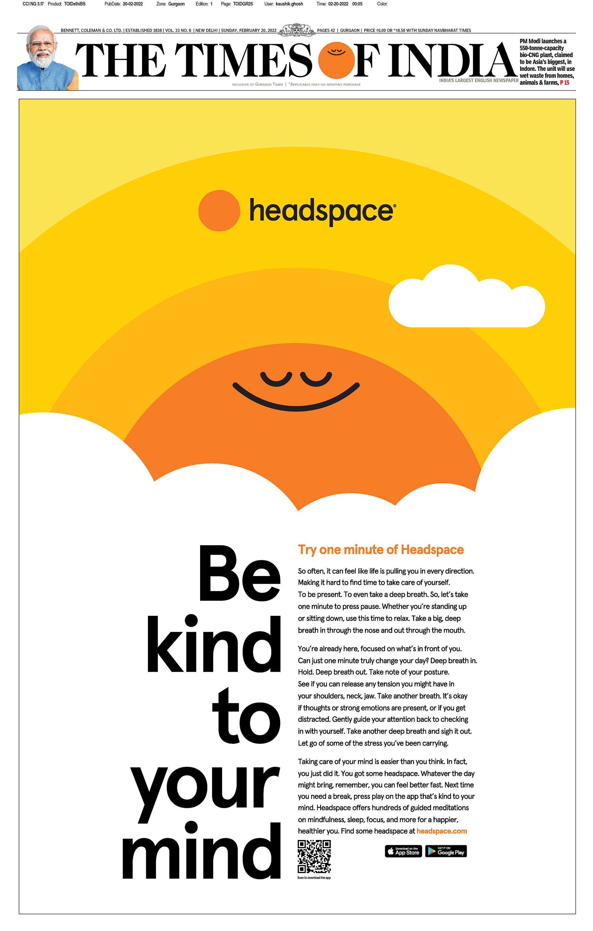 This huge honor was a happy accident. India highly requested this brand launch as mental health awareness gained momentum in the country. I started exploring long-form product copy to support the campaign. When I pitched bringing Headspace to life in one minute — giving readers the care they need that very moment — everyone was sold. The CCO decided to put it on the front page.