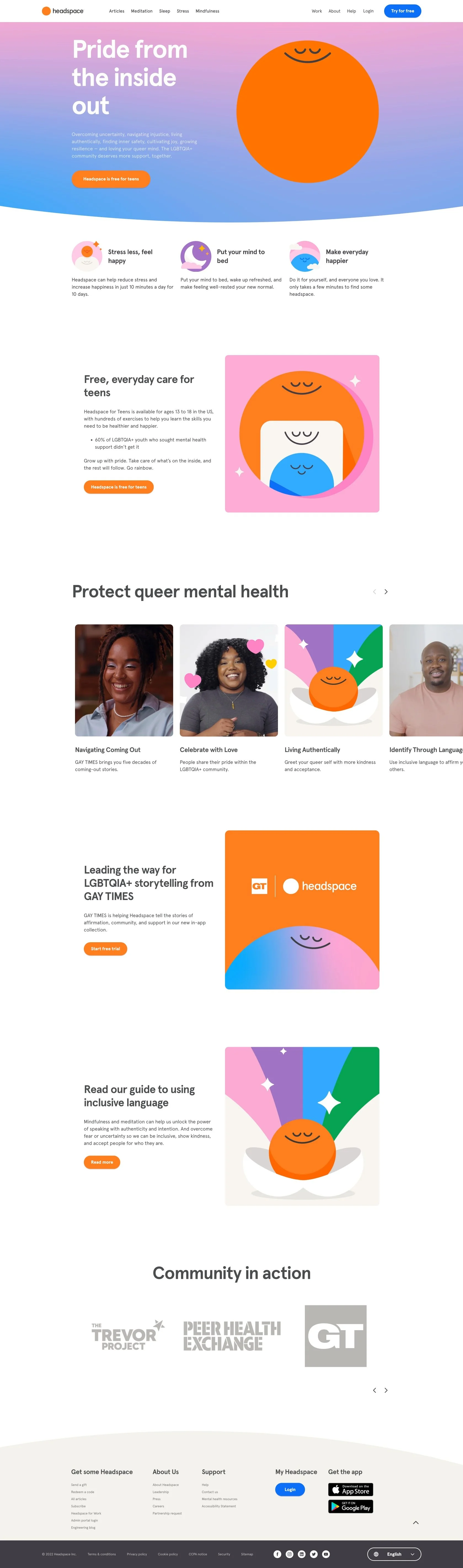 Headspace for Teens helps to provide free, everyday care for students 13-18. Headspace is a proud partner of The Trevor Project, Peer Health Exchange, and GAY TIMES to tell the stories of queer minds.